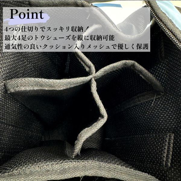 バッグの内側は4つに仕切られており、トウシューズを4足まで縦にすっきり収納できます。