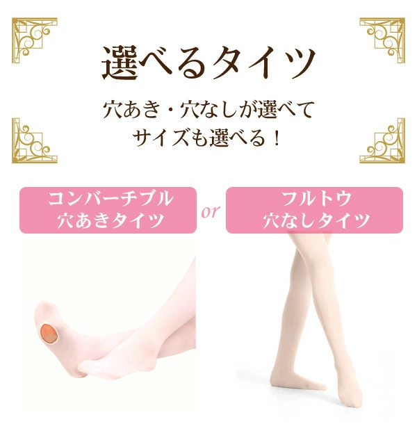 底に穴のない「 フルトウ 」バレエタイツ と底に穴が空いている 「コンバーチブル」タイツ の2種類展開。