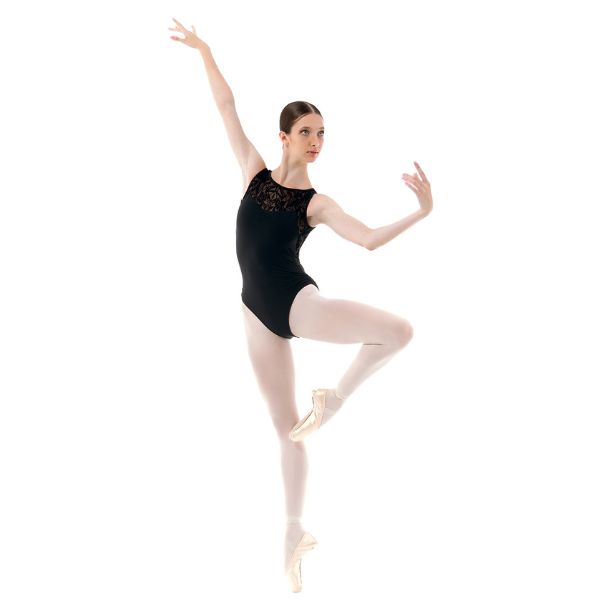胸元から背中にかけてのレース調フロッキーチュールがエレガントな印象を放つ、ハイネック寄りのノースリーブレオタード。