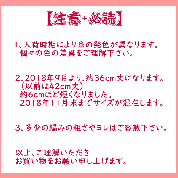 | 注意点 | ・入荷時期により長さや幅に多少の違いがございます!!!ご了承くださいませ。 ・初回着用時は、毛玉ゴミがつくことがございます旨、ご了承くださいませ。 ・特にブラックは、軽くお洗濯してからのご使用をおススメします。 ・ピンクは画像より少し濃いお色になっております。 ・こちらの商品は1枚のみメール便可能です ・他の商品と同梱をご希望の場合は宅配便をお選びくださいませ |