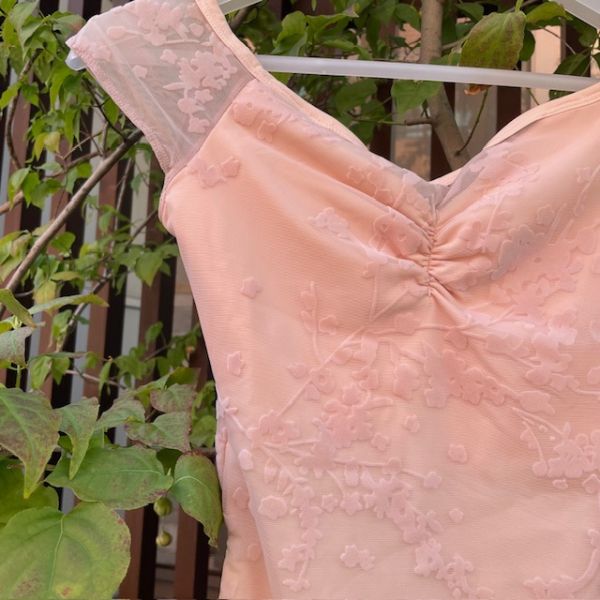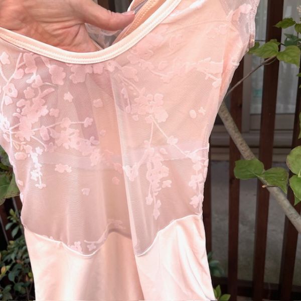 フロントから背中の腰位置まで広がるメッシュ素材が、上品な透け感を演出。