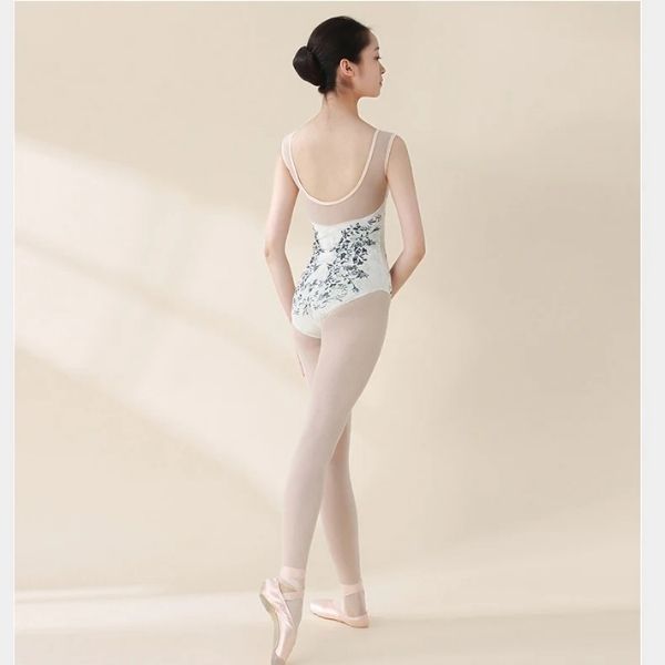 上品な花柄プリントとシアーメッシュの切り替えが魅力の大人用レオタード。