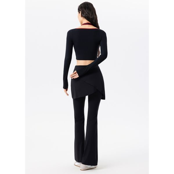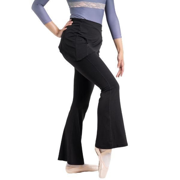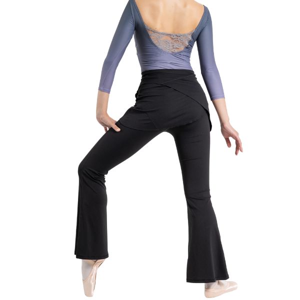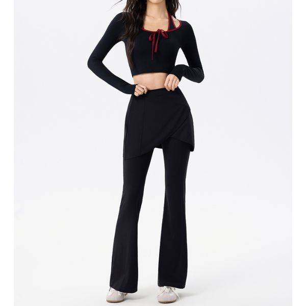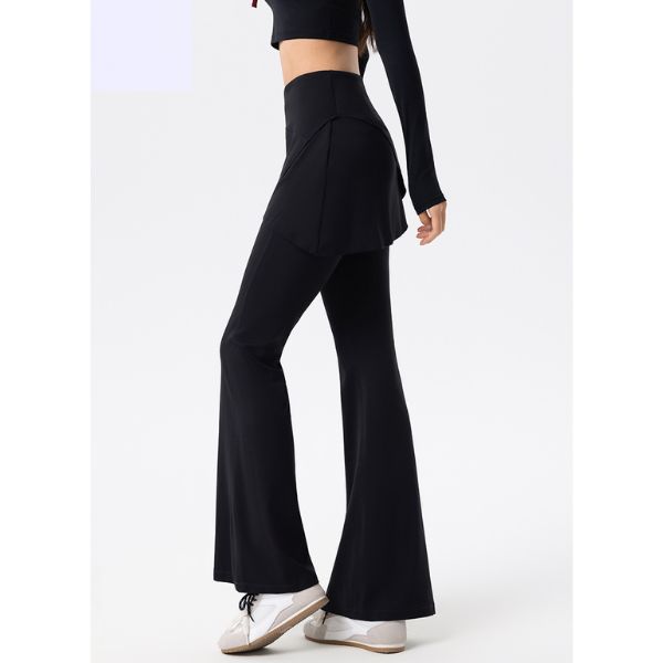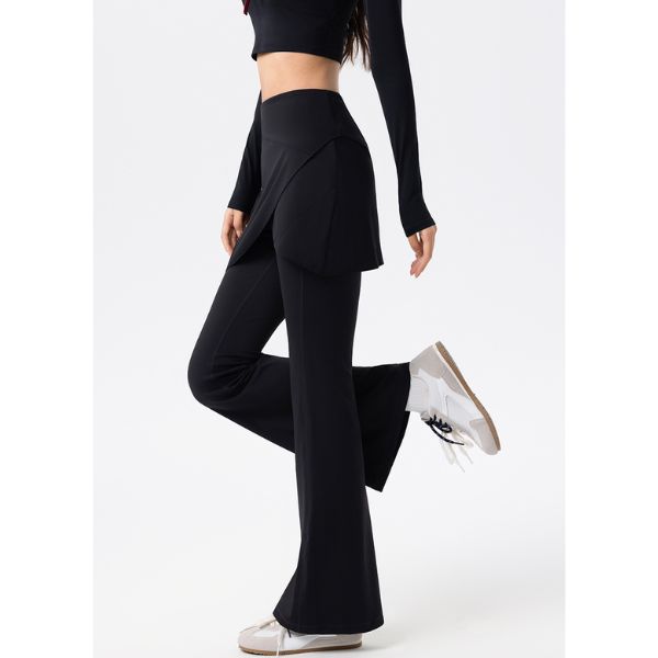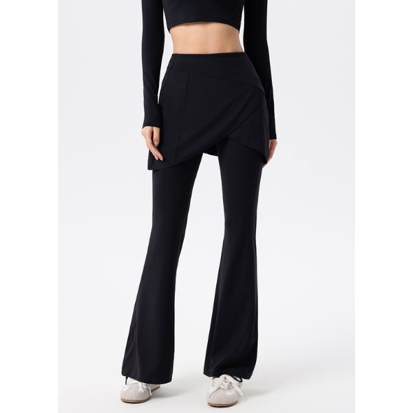 重なりデザインでおしりをカバー、透けにくく安心。ヨガやダンスなど幅広く活躍する、美脚ブーツカットパンツです。