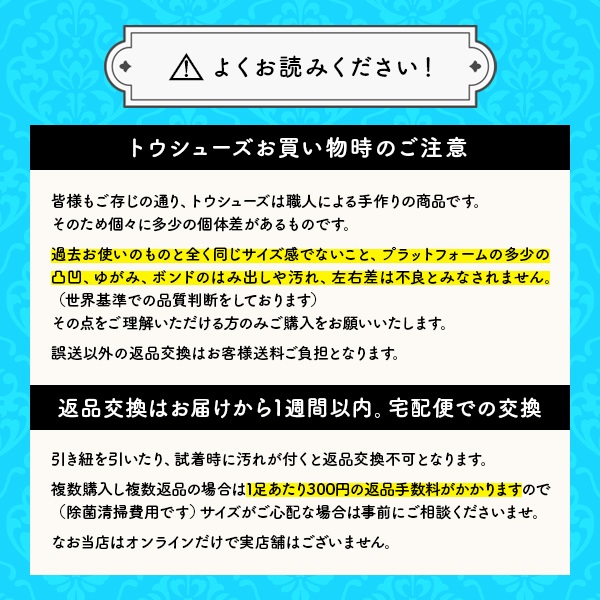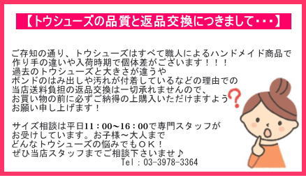 トウシューズは職人による手作りのため、1足ずつ個体差や製造時の多少の汚れがある場合がございます。予めご了承ください。